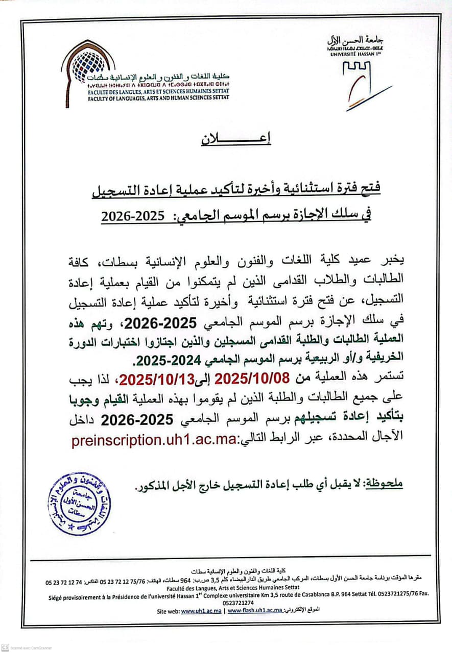 إعلان عن فترة استثنائية وأخيرة لتأكيد عملية إعادة التسجيل في سلك الإجازة برسم الموسم الجامعي 2025-2026 ACTUALITÉS FLASH 8 octobre 2025 flashweb Post Views: 149