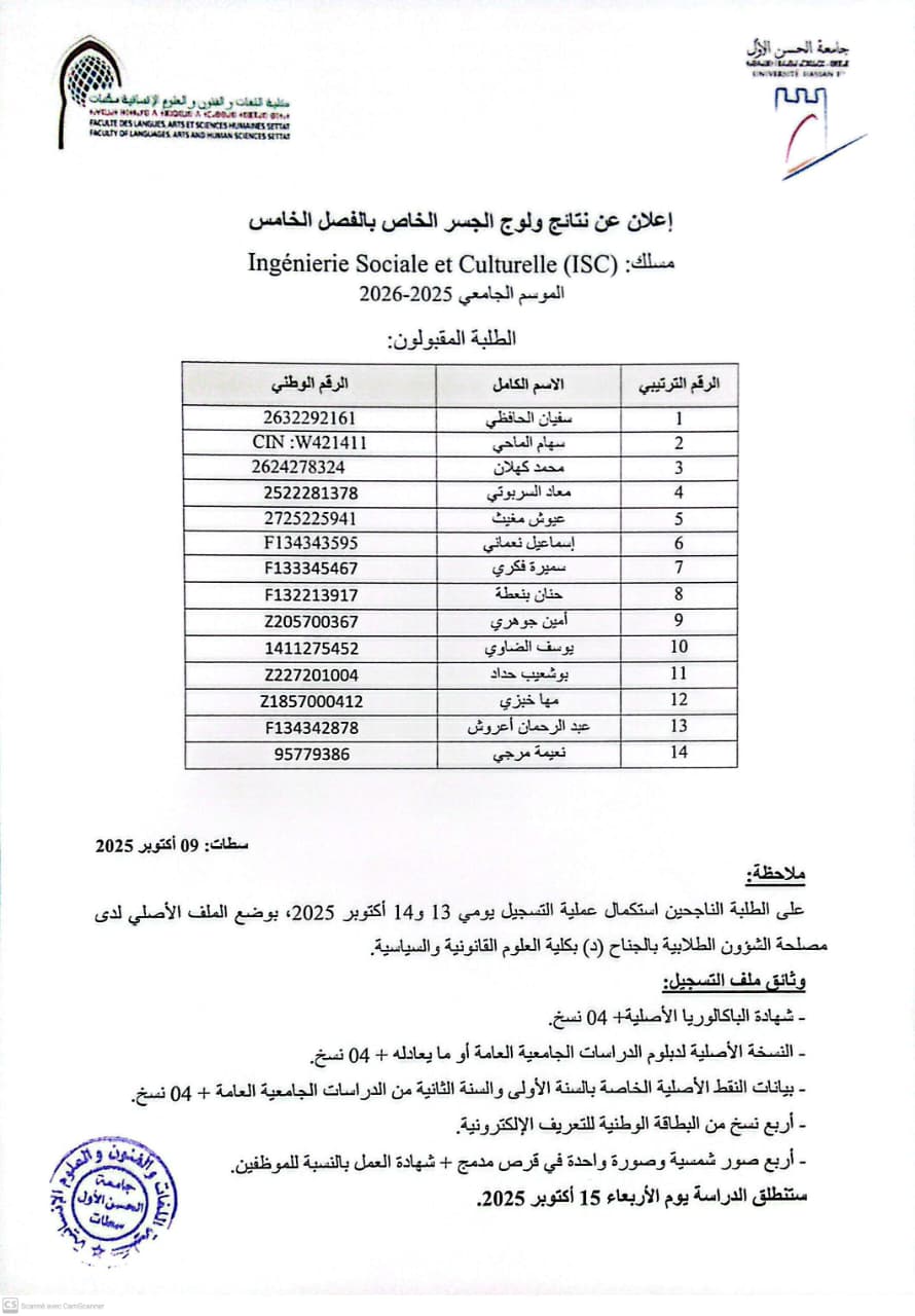 Ingénierie Sociale et Culturelle (ISC) إعلان عن نتائج الناجحين لولوج الجسر الخاص بالفصل الخامس مسلك ACTUALITÉS FLASH 10 octobre 202510 octobre 2025 flashweb Post Views: 111