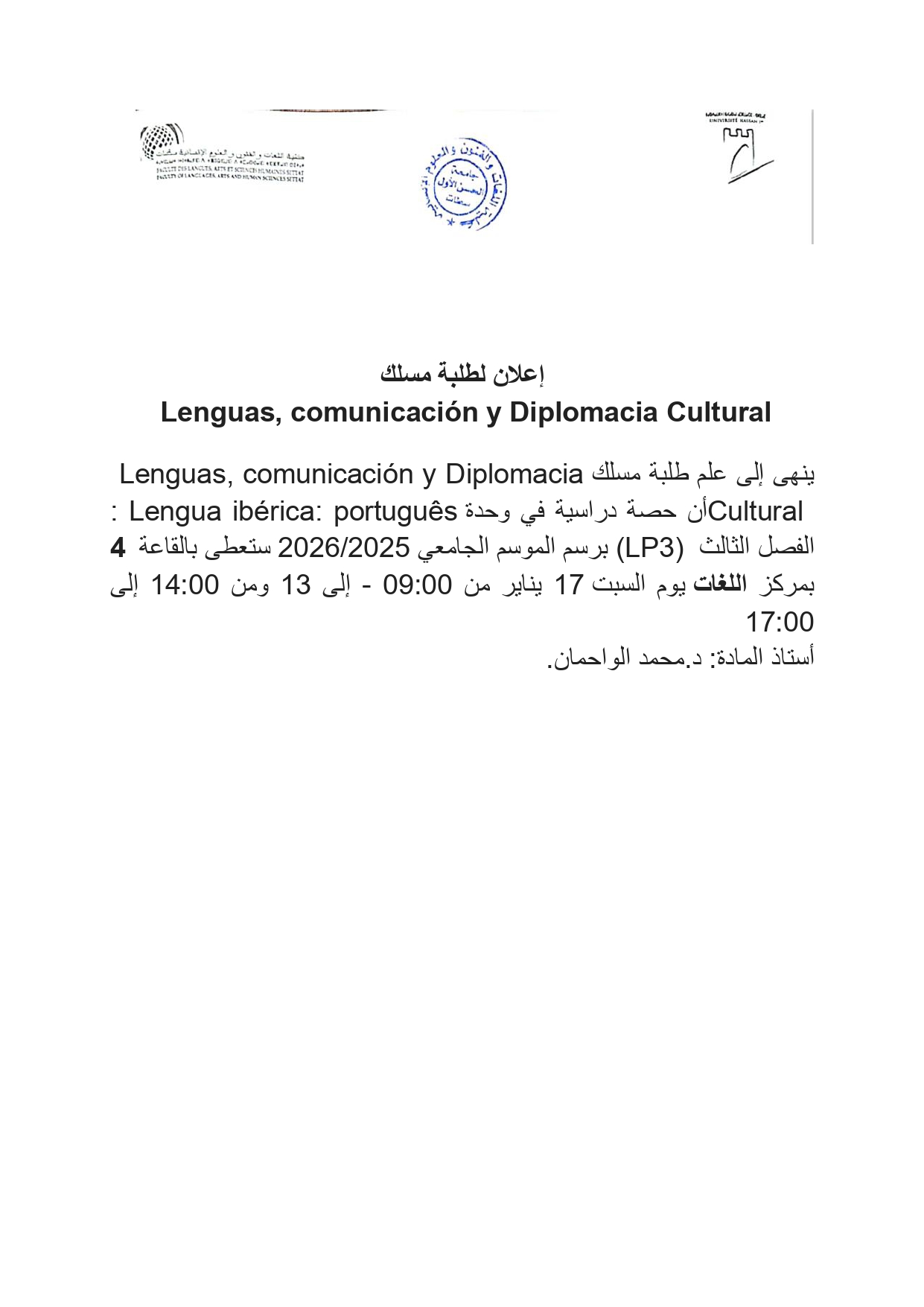 Lenguas, comunicación y Diplomacia Cultural إعلان رقم 2 لطلبة مسلك ACTUALITÉS FLASH 16 janvier 2026 flashweb Post Views: 69
