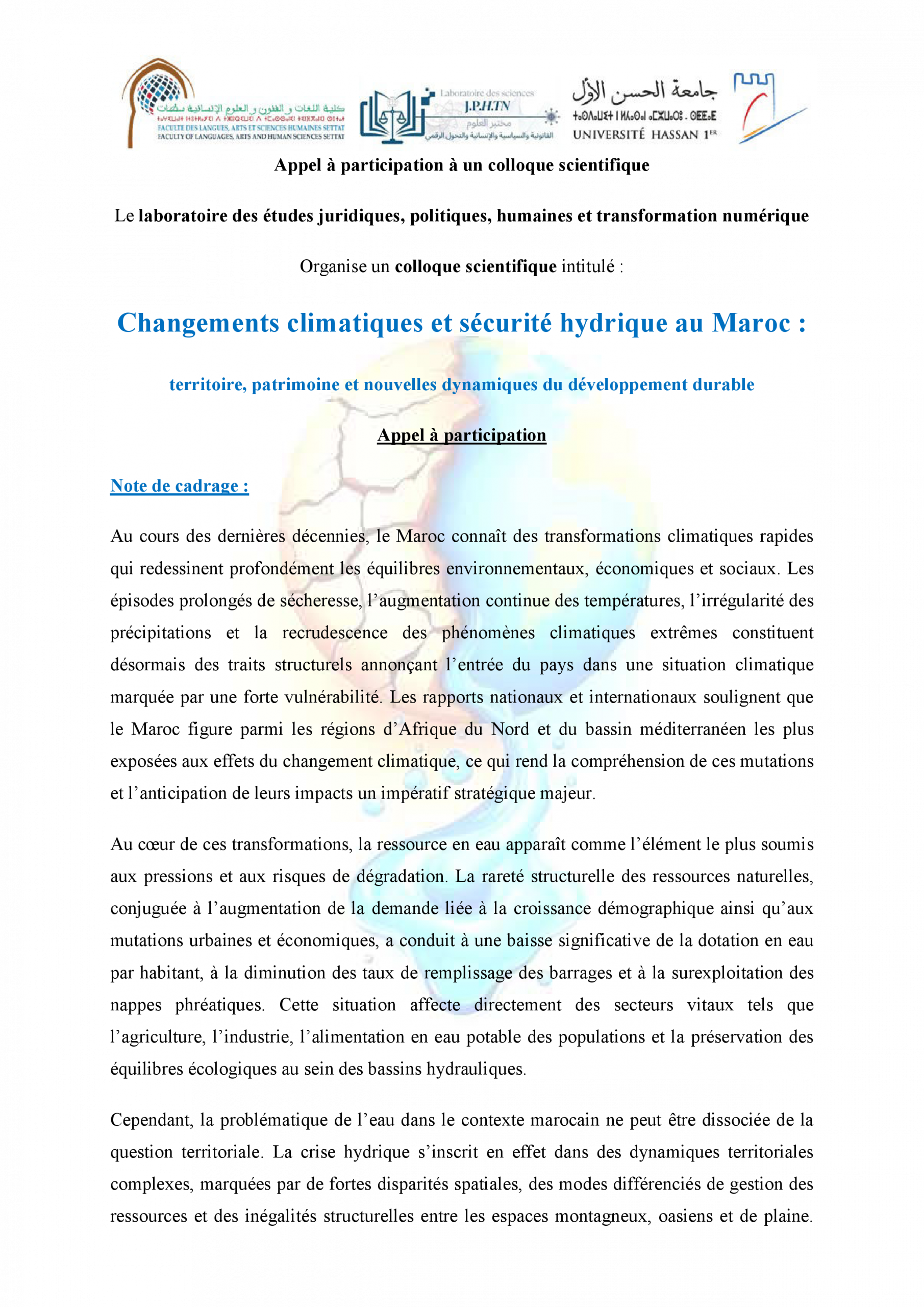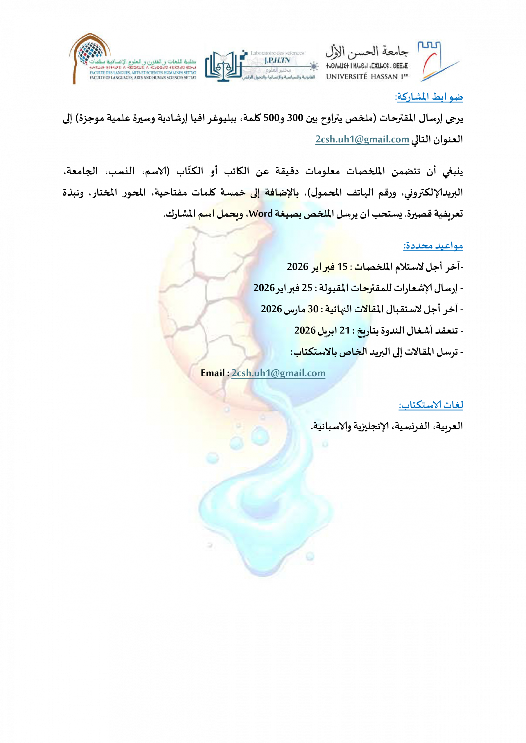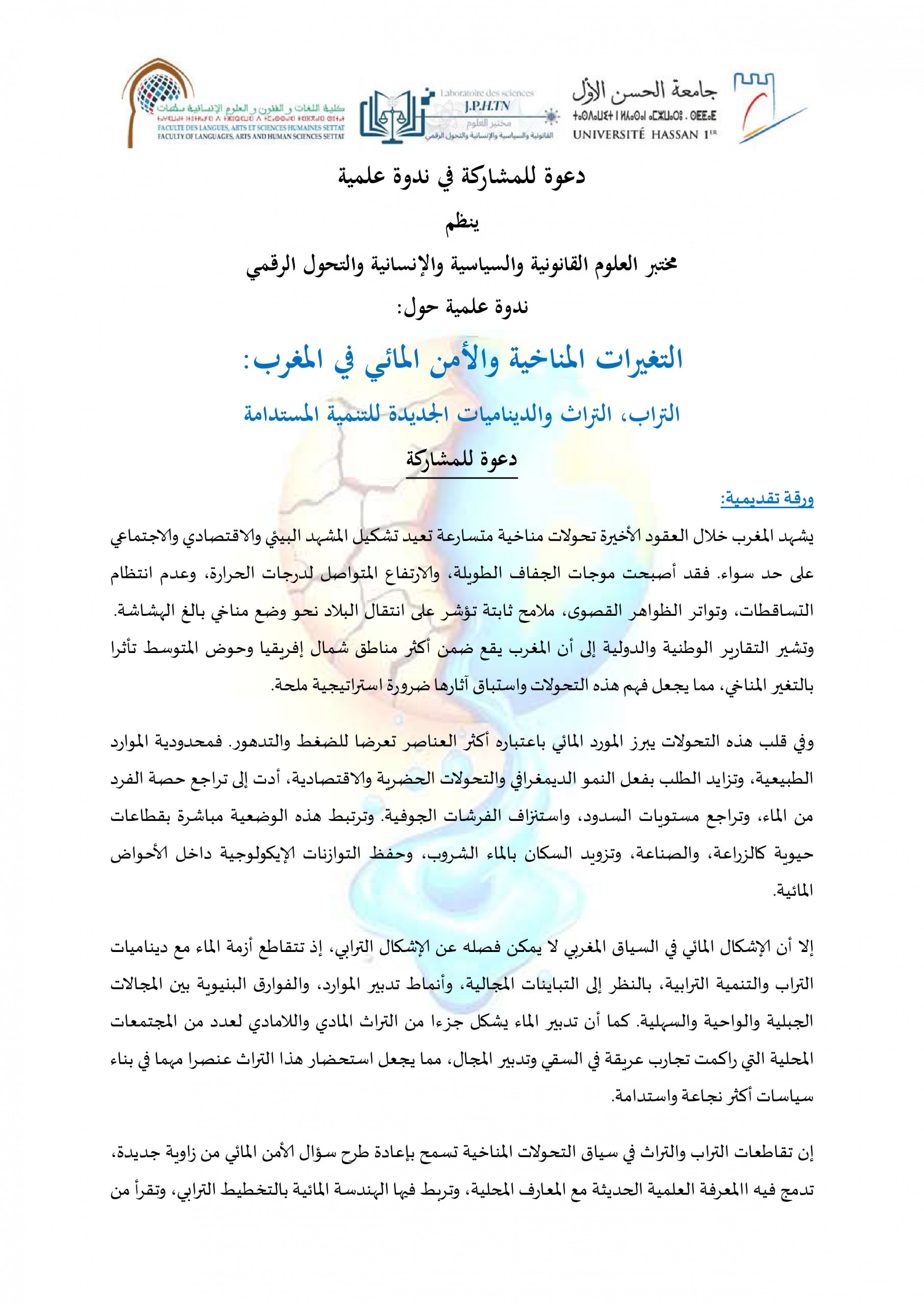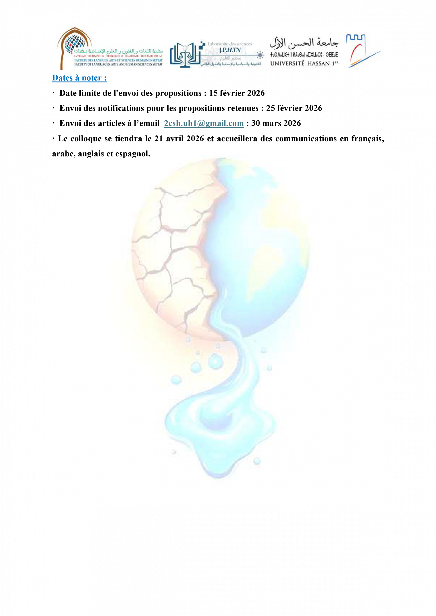 دعوة للمشاركة في ندوة علمية حول: التغيرات المناخية والأمن المائي في المغرب: التراب، الثرات والدينامية الجديدة للتنمية المستدامة ACTUALITÉS FLASH 3 février 2026 flashweb Post Views: 21