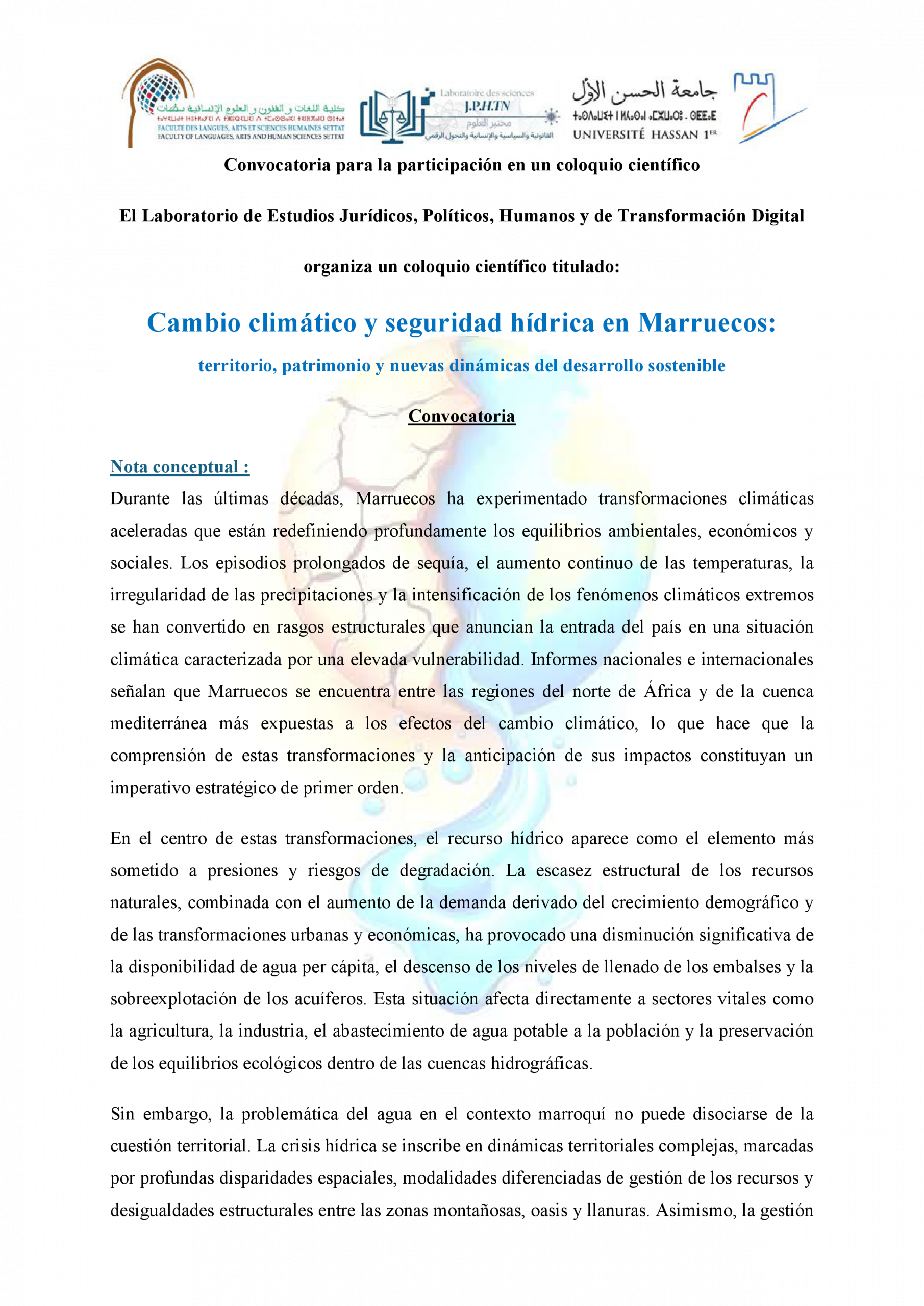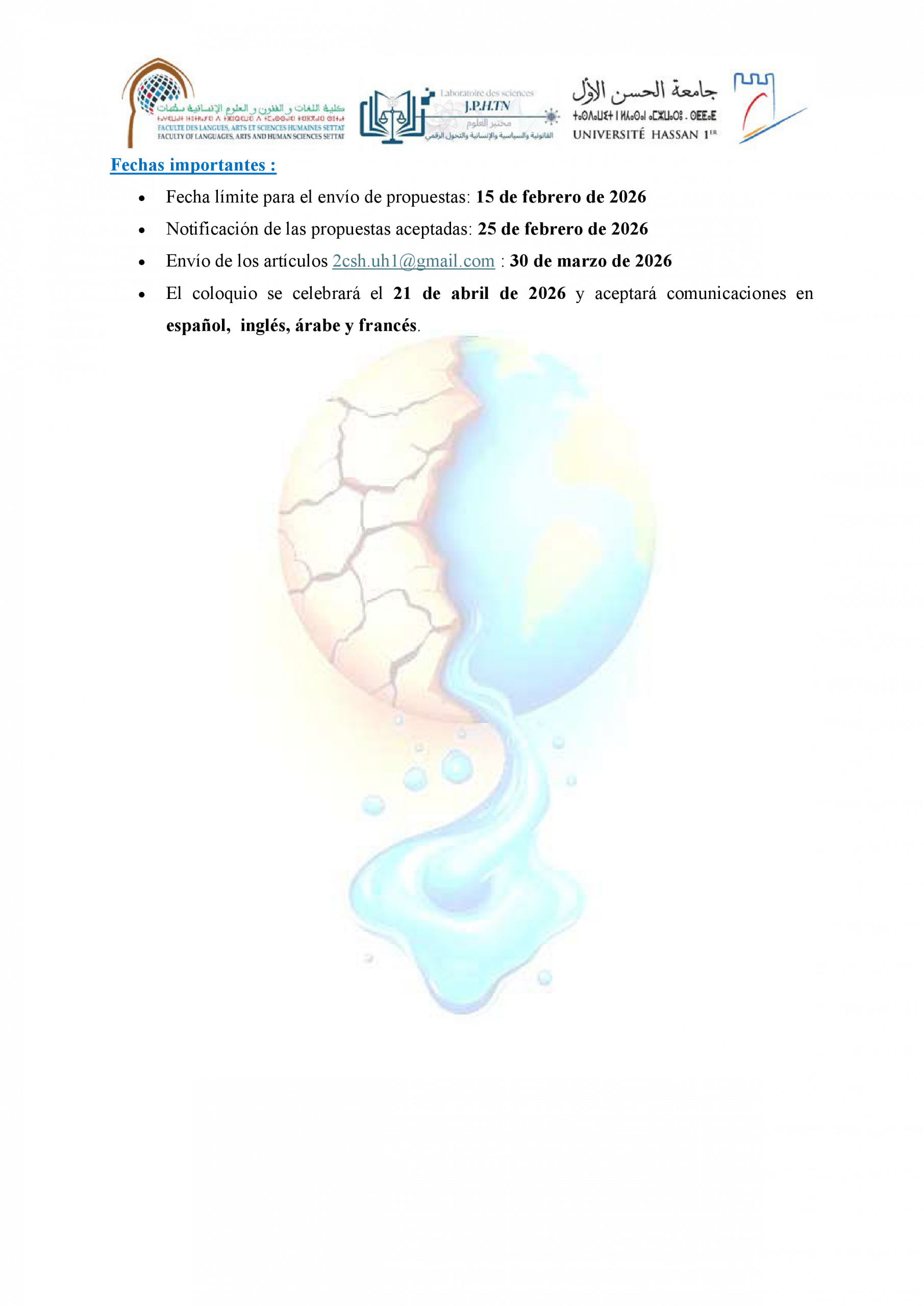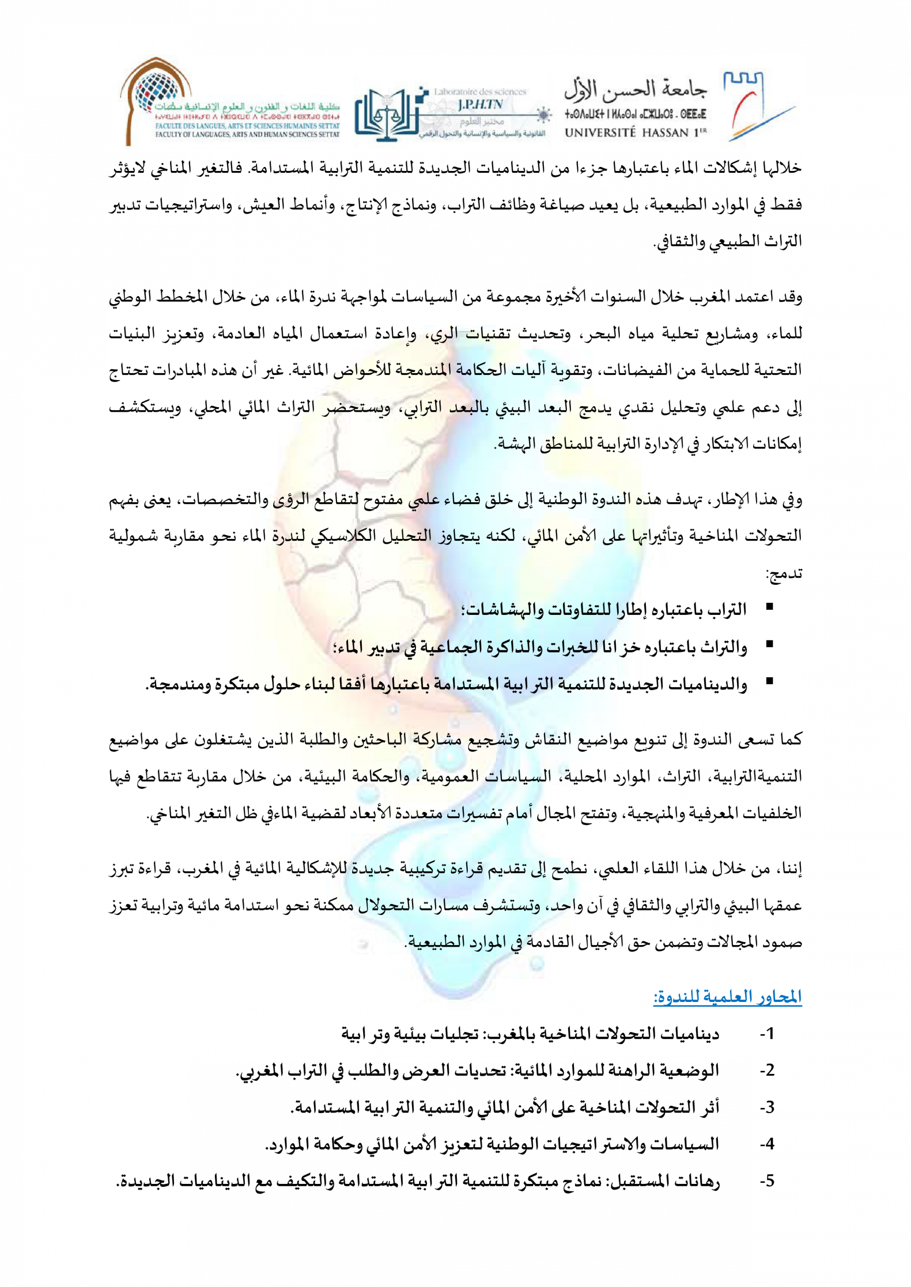 دعوة للمشاركة في ندوة علمية حول: التغيرات المناخية والأمن المائي في المغرب: التراب، الثرات والدينامية الجديدة للتنمية المستدامة ACTUALITÉS FLASH 3 février 2026 flashweb Post Views: 21