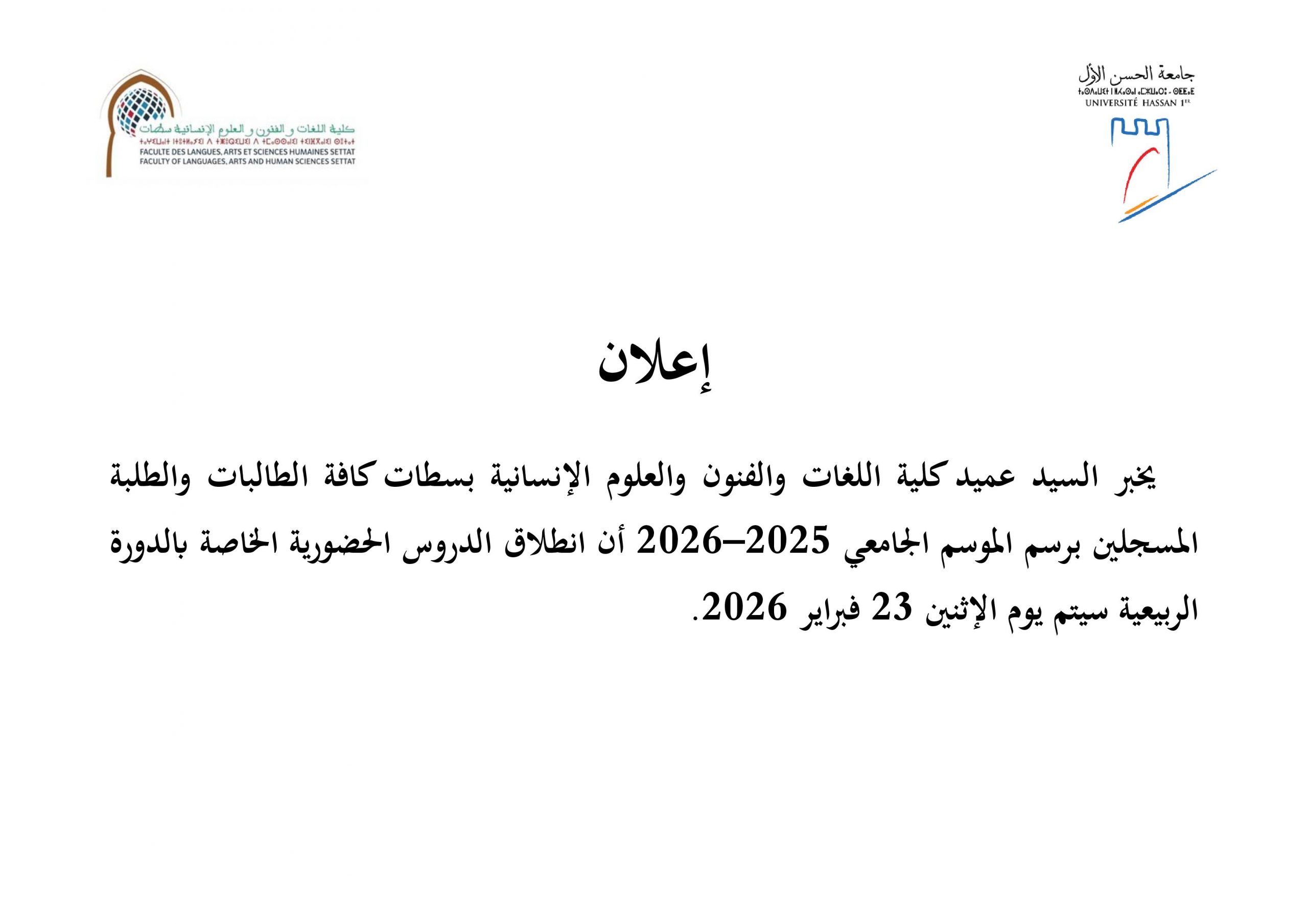 إعلان عن انطلاق الدروس الخاصة بالدورة الربيعية ACTUALITÉS FLASH 20 février 2026 flashweb Post Views: 260